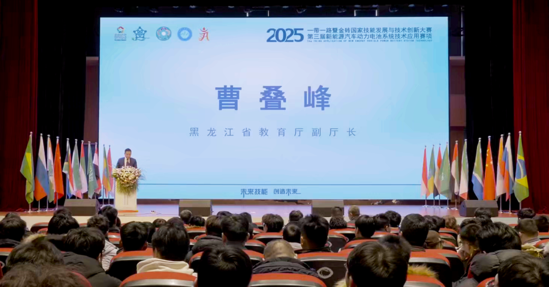 黑龙江省教育厅副厅长曹叠峰在致辞中表示,对大赛落地哈尔滨表示热烈祝贺,强调哈尔滨正全力打造技能人才集聚高地,本次大赛聚焦新能源汽车核心技术领域,既契合城市产业发展方向,也为区域技能人才交流搭建了重要平台,希望以赛事为纽带,深化各方合作,助力新能源产业高质量发展。