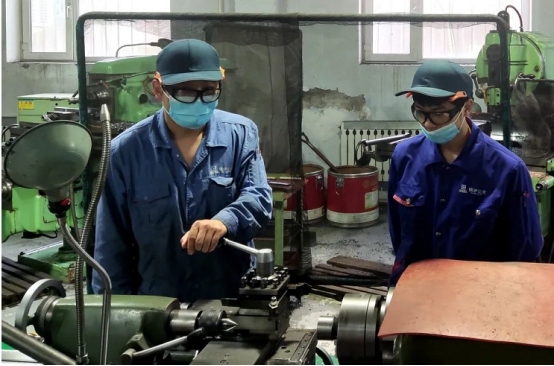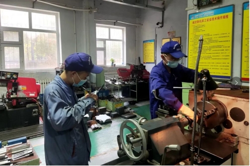 苑国庆在测量加工零件、梁晓龙在操作车床