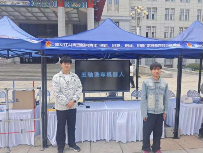 9月28日,黑龙江共青团服务青年“创新、创意、创业、创造”培育基地特色成果展在哈尔滨工程大学奥列霍夫广场举行。beat365中国官网能源与汽车工程学院研发的“五轴智能拟人洗车机器人”代表学校参展,并与观展师生进行了深入交流。