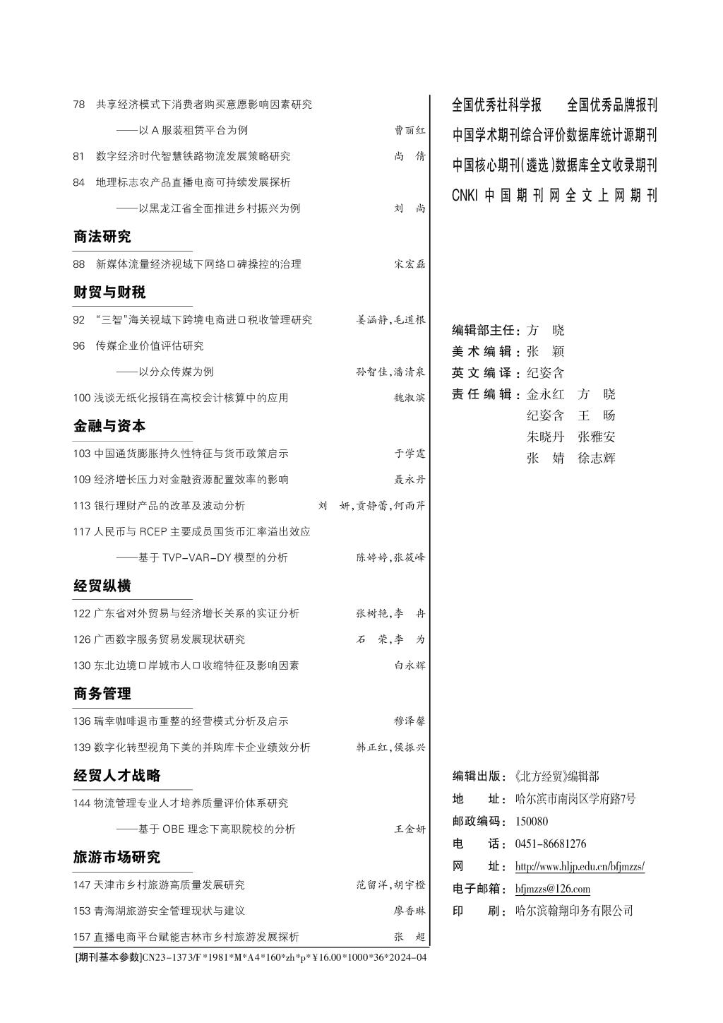 版权所有:北方经贸杂志社 地址:黑龙江省哈尔滨市南岗区学府路5号 邮编150080 电话:0451-86681276 86646778 邮箱:bfjmzzs@126.com