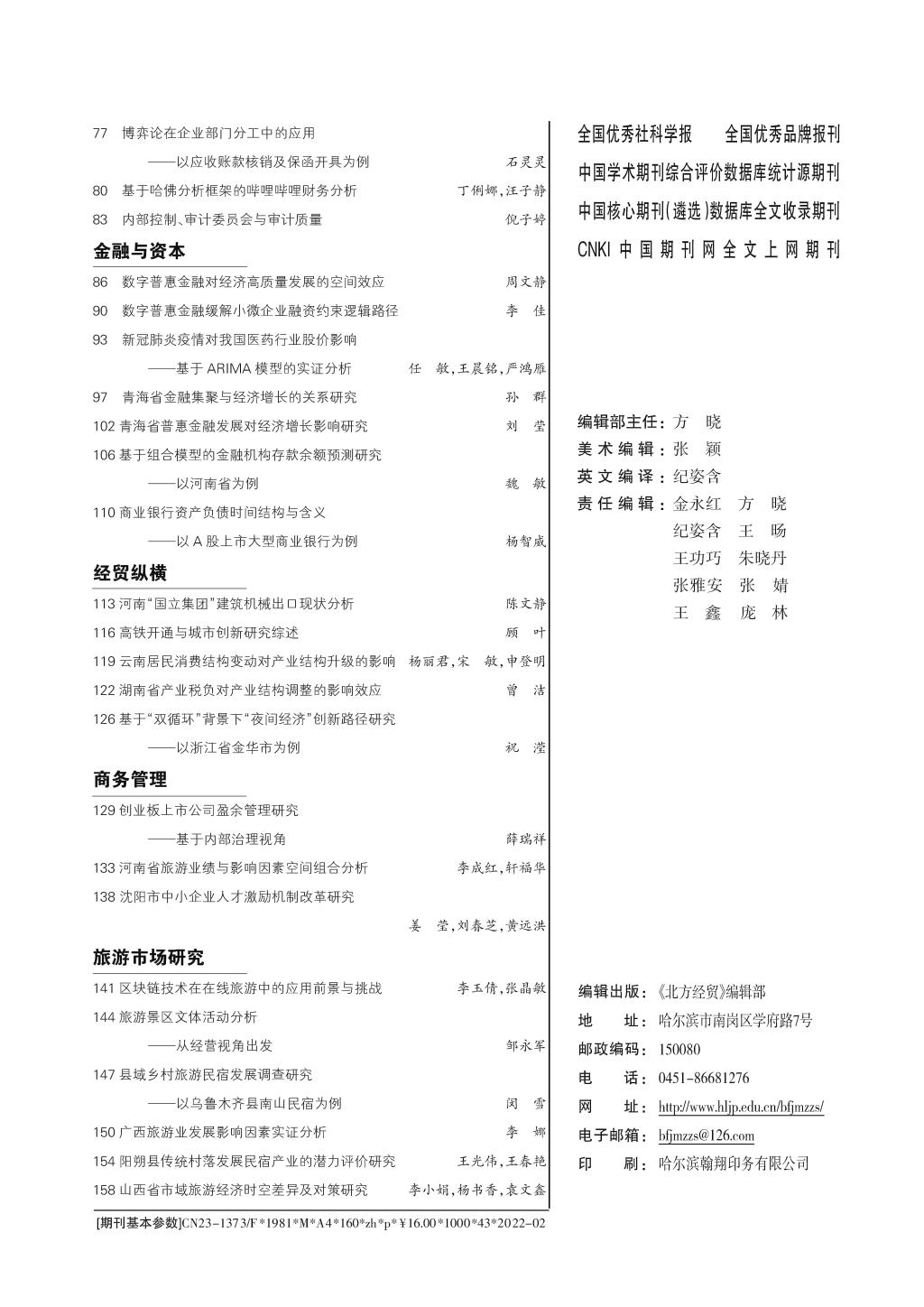 版权所有:北方经贸杂志社 地址:黑龙江省哈尔滨市南岗区学府路5号 邮编150080 电话:0451-86681276 86646778 邮箱:bfjmzzs@126.com