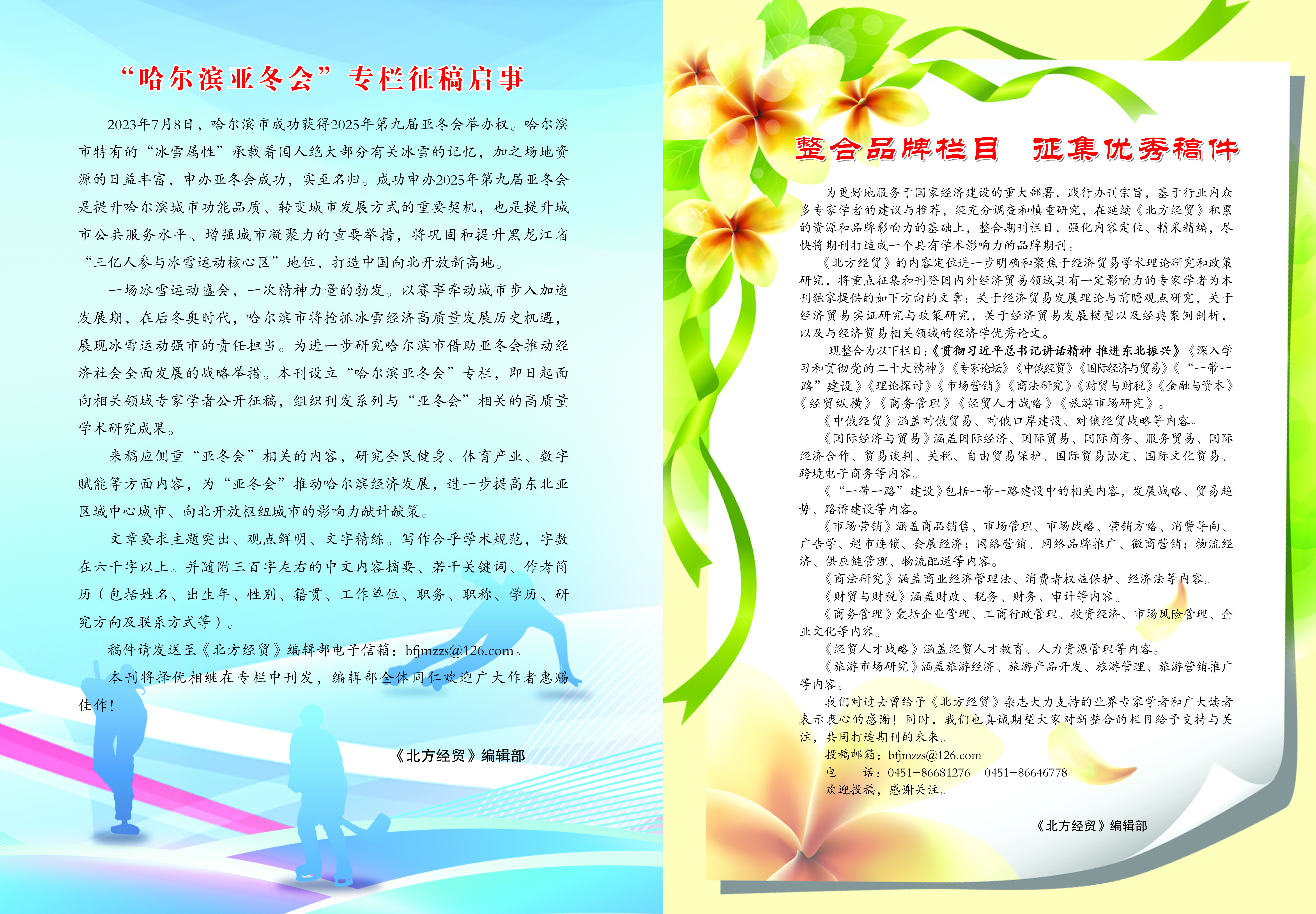 版权所有:北方经贸杂志社 地址:黑龙江省哈尔滨市南岗区学府路5号 邮编150080 电话:0451-86681276 86646778 邮箱:bfjmzzs@126.com