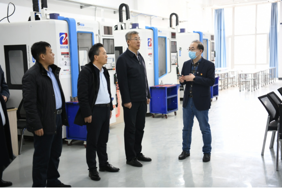 在王利文、王明海陪同下,考察团参观了beat365智能制造技术学院的工业中心、多轴加工实训室、增材制造实训室、数字化检测实训室、工业机器人训练中心和信息工程学院的华为认证VUE考试中心、虚拟现实工作室、录播室、大数据实训室。智能制造技术学院院长李子峰、信息工程学院院长张晓霖对实训室建设进行详细介绍。