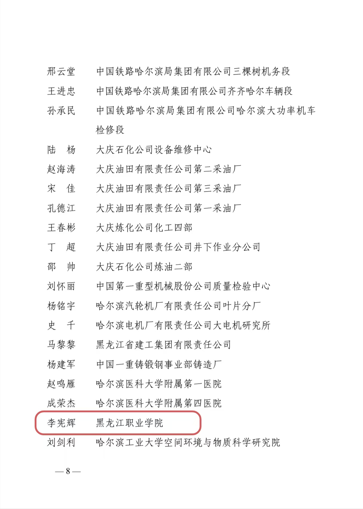 近日,省总工会印发了《关于公布2024年龙江工匠培育对象的通知》,100人被确定为2024年度“龙江工匠”培育对象,我院教师李宪辉荣获此项殊荣。