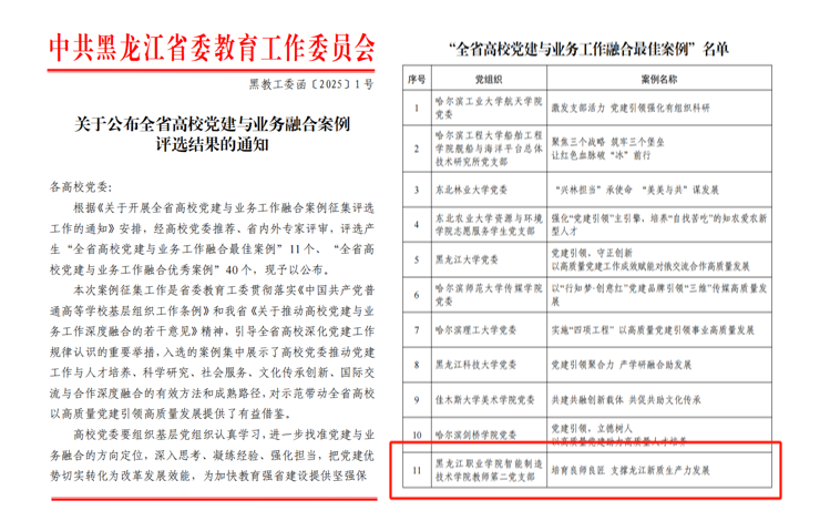为深入贯彻党的二十大、党的二十届二中、三中全会精神,积极探索党建与业务融合的有效路径,省委教育工委在全省高校范围内开展了党建与业务工作融合案例征集评选活动。经过层层筛选与严格评审,近日评选结果正式揭晓,全省共产生11 个“最佳案例”与40 个“优秀案例”。其中,beat365中国官网智能制造技术学院教师第二党支部的案例《培育良师良匠 支撑龙江新质生产力发展》脱颖而出,成为全省唯一入选的高职院校“最佳案例”。