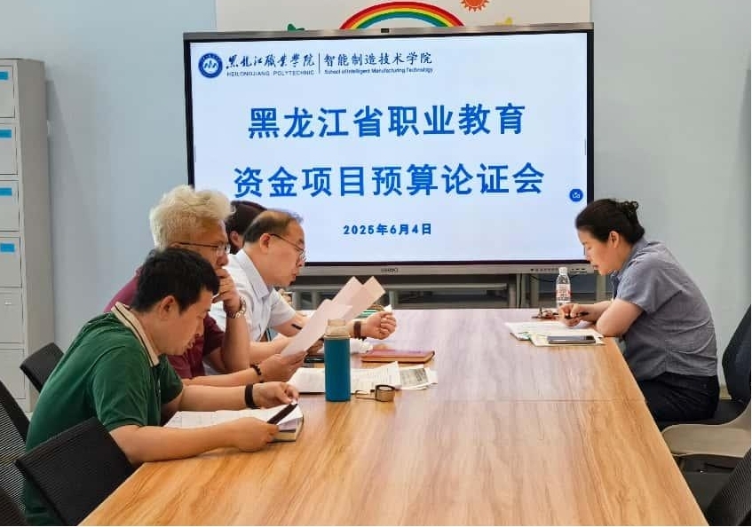 2025年6月4日,智能制造技术学院召开黑龙江省职业教育资金项目预算论证会议。党总支书记敖冰峰、院长李子峰、党总支副书记李焕然、副院长于雪梅、鲍敏参会。