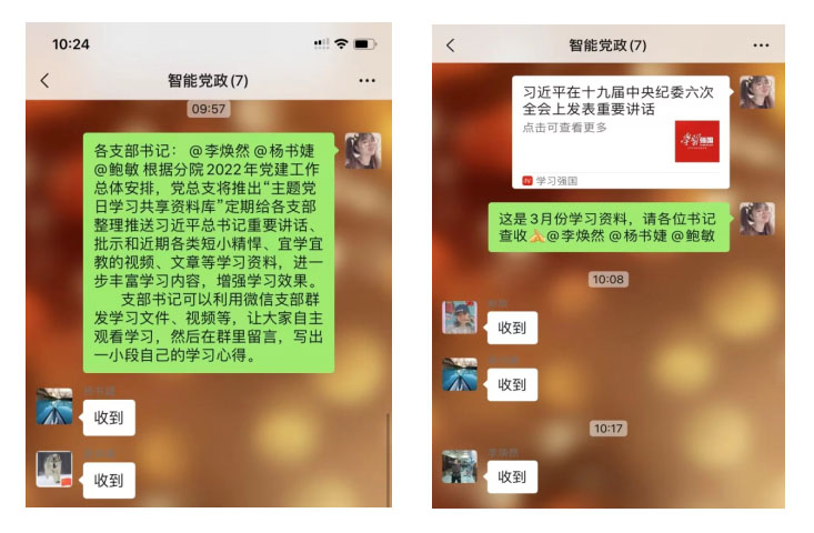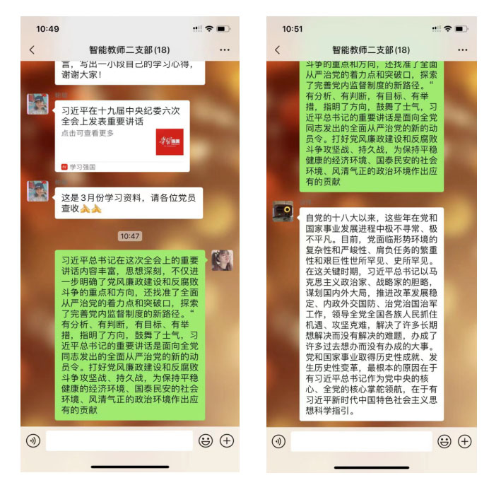 针对当前疫情情况,智能制造技术学院党总支及时创新主题党日活动形式,打破时间和空间限制。党员同志们在“线上”集结,在支部微信群里以“文件+视频+心得”的形式进行学习,让党旗在网络世界高高飘扬。