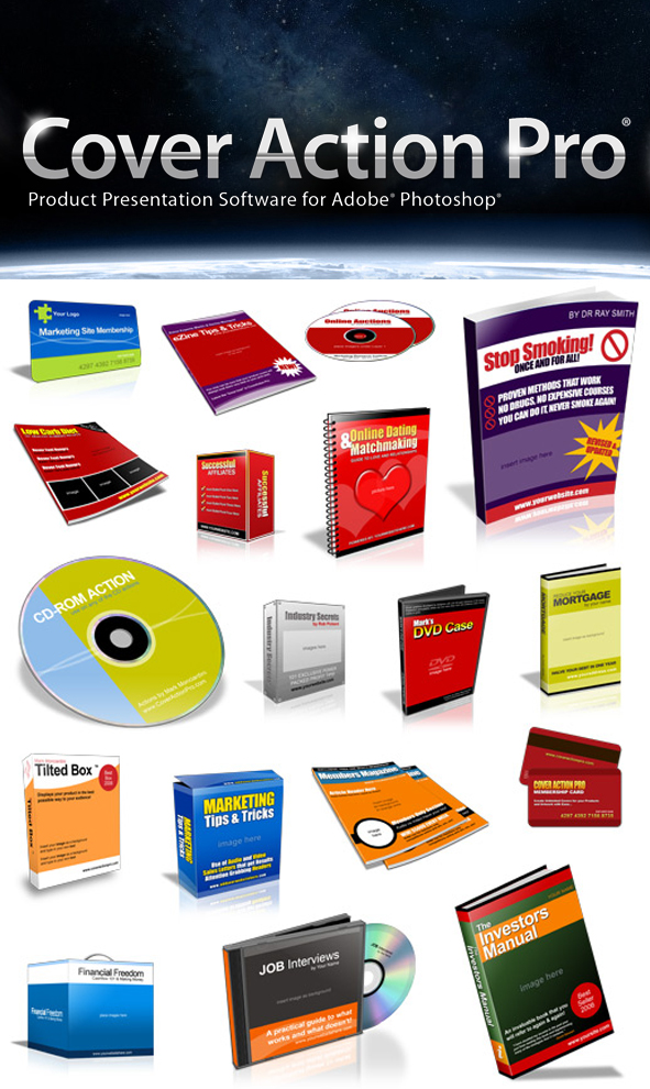 CoverAction Pro 是一套 PhotoShop 的动作,主要用于广告设计等方面,可以用它配合 PhotoShop 制作出精美的CD封面、包装盒、书籍的封面,等等。
