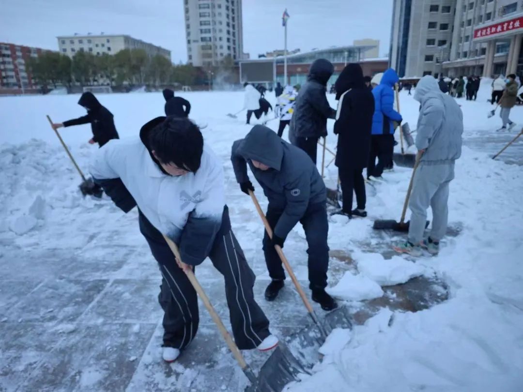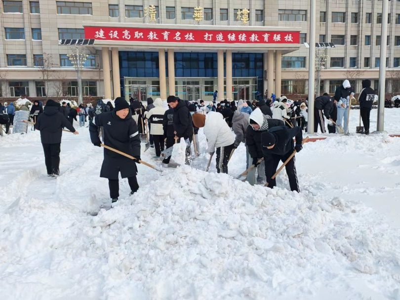 同学们在党总支副书记李焕然和2023级辅导员的带领下,有序的清扫积雪,拿好铁锹在分配区挥锹铲雪,传递真情,奉献青春力量。积雪也在师生们的劳动下清扫的干干净净,并开辟了一条干净、畅通的路。