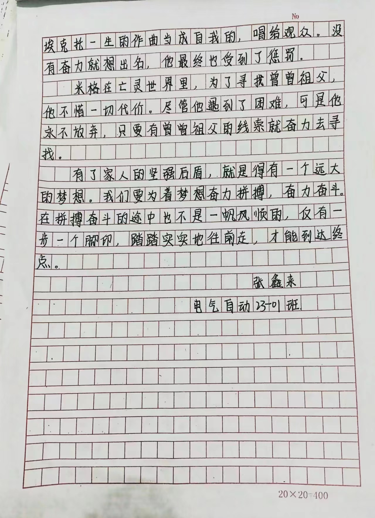 影片以其精美的画面、动人的音乐和深刻的主题,深深地吸引着每一位同学。它带领我们进入了一个充满奇幻色彩的世界,跟随主人公米格的脚步,一同踏上了一段寻梦之旅。在这个过程中,我们感受到了家庭的温暖与重要性。电影告诉我们,亲情是无尽的牵挂,是跨越生死的纽带。无论何时何地,家人永远是我们最坚实的后盾。