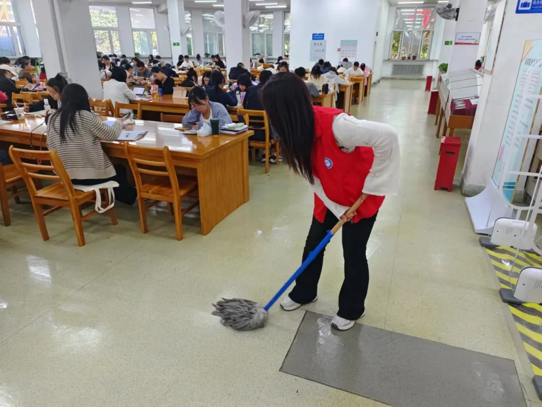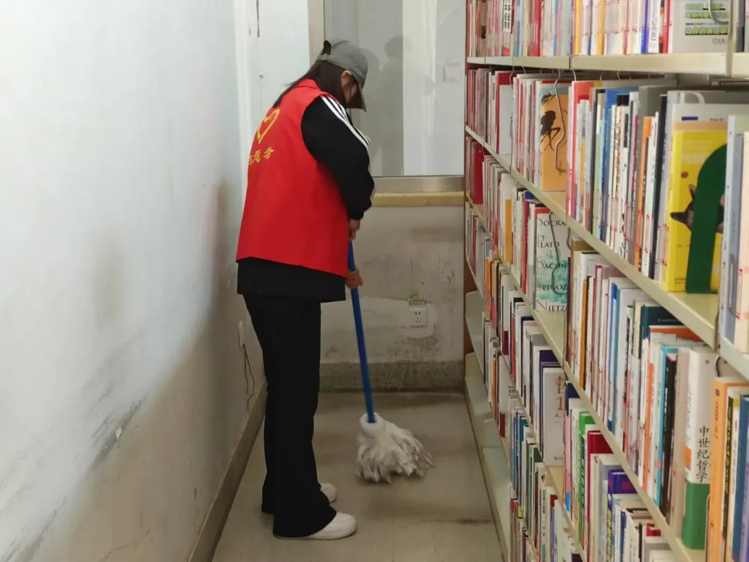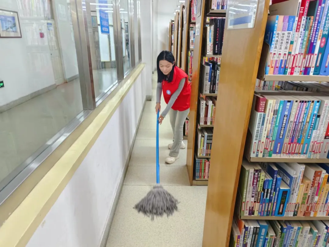 志愿服务期间,在管理员的带领下,志愿者们迅速投入到各自的岗位中,他们擦拭窗台,整理图书,清理地面。清理过程中,志愿者们展现出了高度的责任感和团队合作精神。他们认真细致地完成每一项任务,不仅为读者提供了便利,也为图书馆营造了一个更加舒适、整洁的阅读环境。