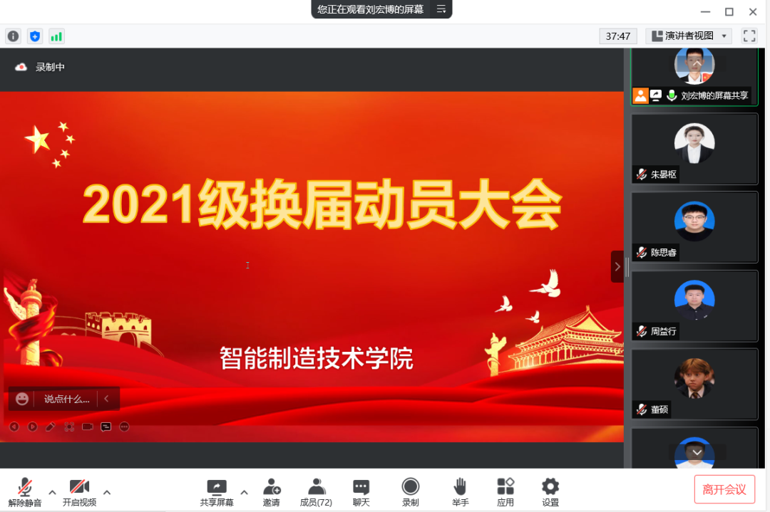 站在新起点、迎接新挑战、创造新成绩,进一步加强智能制造技术学院学生组织的队伍建设,保障学生工作的连续性,加强我院学生组织工作人员的选拔、考核和培养工作,全面提高其综合素质,以公平、公正、公开的原则选拔出具有较高政治素质,工作责任心强,愿为广大同学服务的工作人员。智能制造技术学院召开2021级换届动员大会,本次会议由学生会主席刘宏博主持。