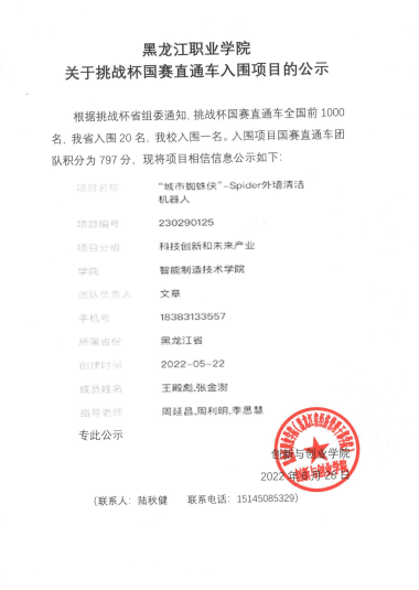 6月28日,根据第十三届工银融e联“挑战杯”黑龙江省大学生创业计划竞赛大赛省组委会通知,beat365智能制造技术学院《“城市蜘蛛侠”—spider外墙清洁机器人》项目成功入围国赛直通车全国前1000名,我省共有20个项目入围,beat365是全省高职院校中唯一入围项目学校。