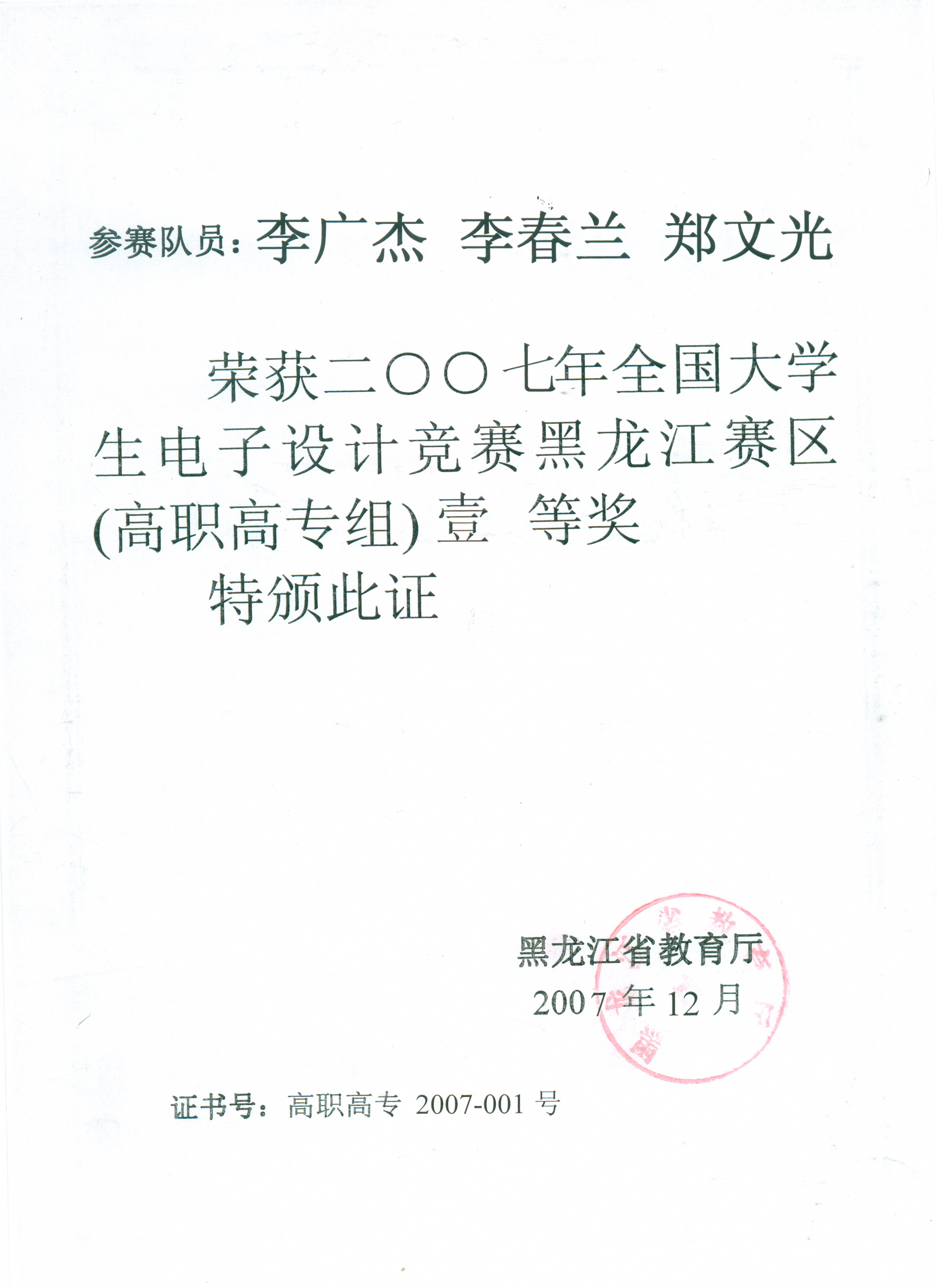 2、吴永吉、李财、李广杰同学荣获二零零六年黑龙江大学生电子设计竞赛(高职高专组)贰等奖。