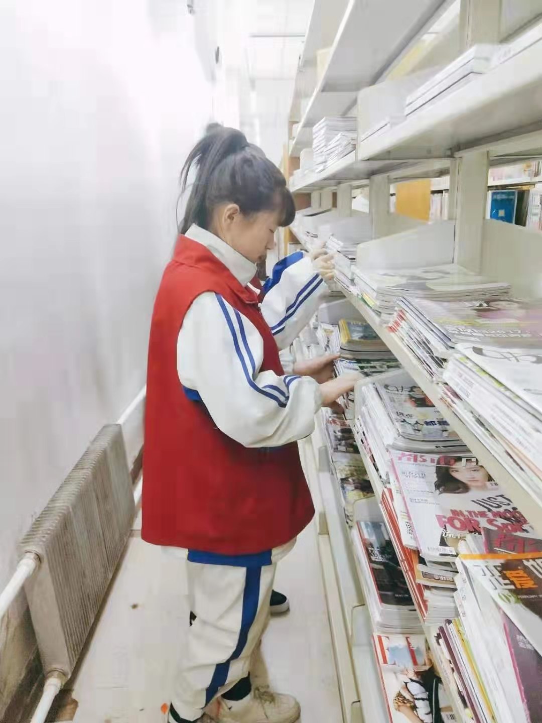 为了有效快速的帮助图书馆工作人员减轻负担,我们每一个人负责一个部分,先把书籍按照种类放在书架上,然后按照书号摆放,最后再把参差不齐的书籍摆放整齐。在图书管理员和带队队长的帮助下,所有人的工作都完成的井然有序。虽然整理书籍非常的枯燥和疲劳,但是同学们没有丝毫的怠慢,还是很仔细,很细心的完成了志愿者活动