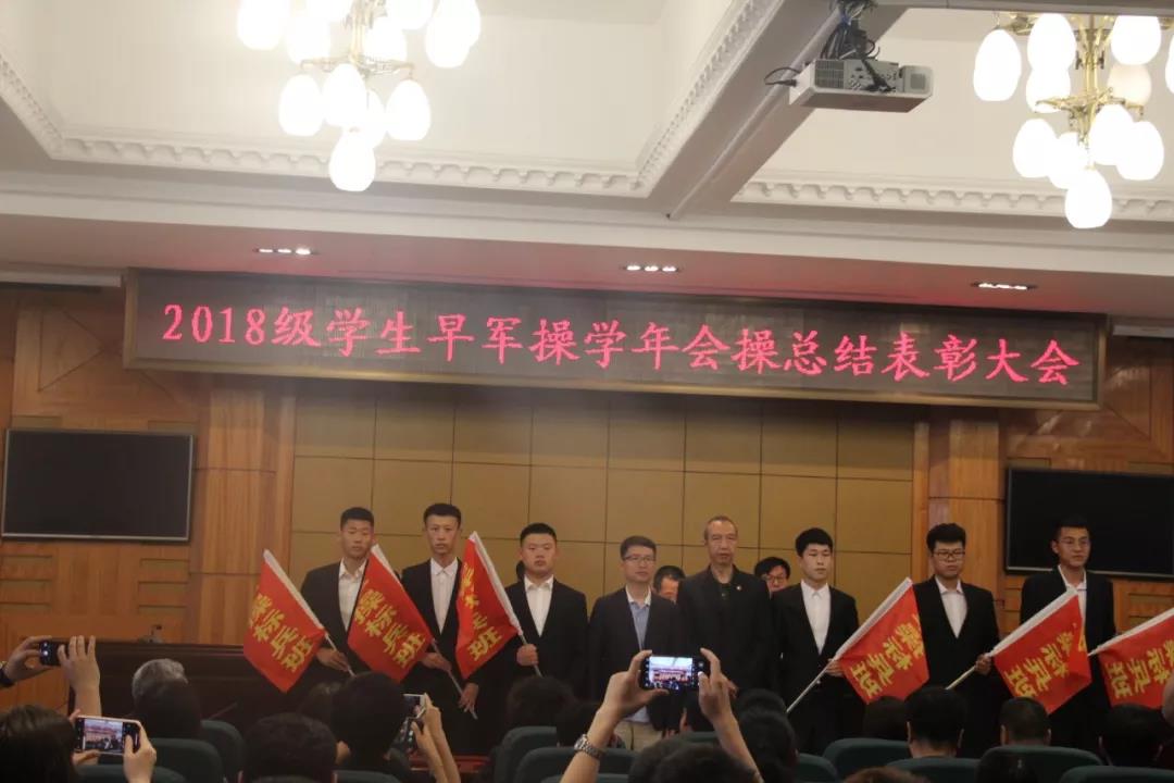 会上由陈宇辉副处长宣读2018-2019学年学生早军操评比表彰奖励决定,在此次大会中电气工程学院的同学们半学期中把超越自我、升华自我作为目标,团结一致,整齐划一用他们的不懈努力夺得“三等奖”,同时电气自动18-02班、电气自动18-03班、电气自动18-04班、电气自动18-05班、工业机器18-03班荣获“军操标兵班”。