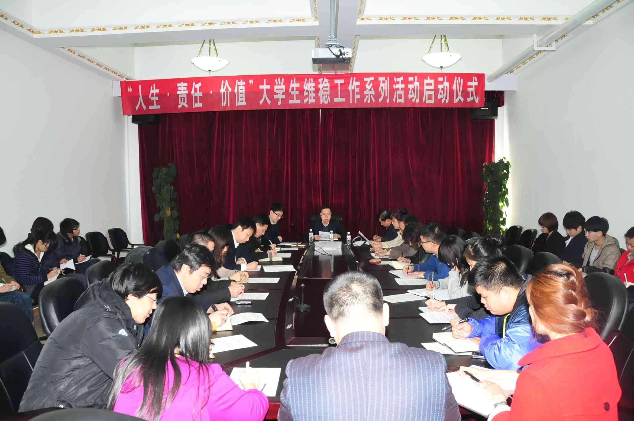3月9日下午1:30,以“人生•责任•价值”为主题的大学生维稳工作系列活动启动仪式在党委会议室举行。院党委书记冯玉龙、副书记张玉山同志出席仪式并分别作了重要讲话。党委宣传部、学生工作部(学生处)、校园文化部和二级学院等有关部门同志和部分学生干部参加了此次活动。