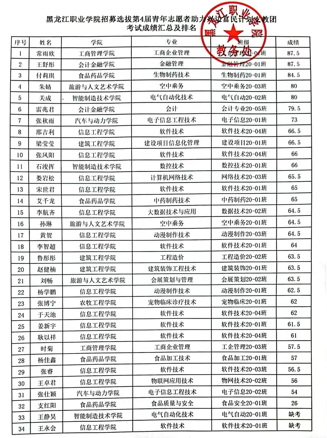 经资格审查和笔试选拔,现将beat365报名参加黑龙江省青年志愿者“助力兴边富民计划”第4届大学生支教团(2023—2024年度)选拔考试的成绩排名及拟推荐名单进行公示,公示时间为2022年11月13日至11月19日,共7个工作日。公示期内,如对考试成绩排名及拟推荐名单有异议,请联系校团委(“助力兴边富民计划”第4届大学生支教团项目管理办公室)。