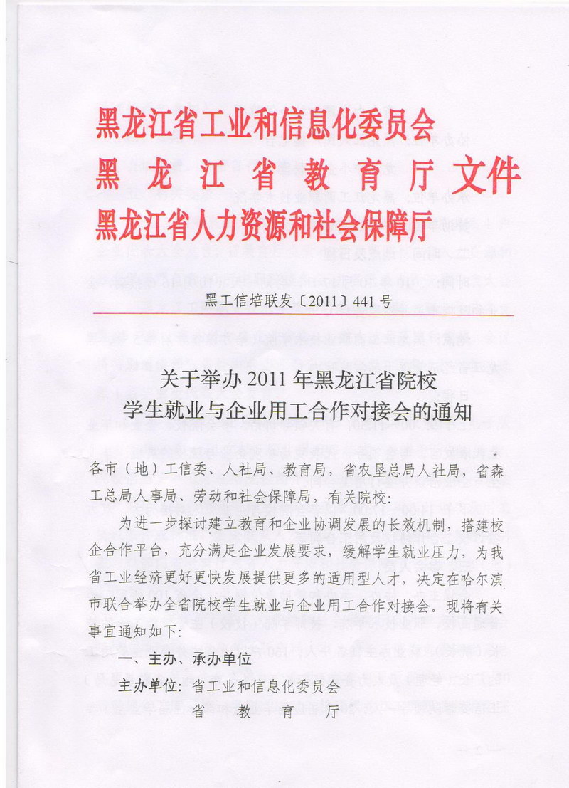 关于举办2011年黑龙江省院校学生就业与企业用工合作对接会的通知