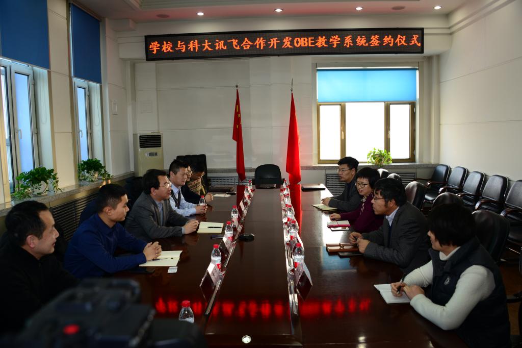 12月22日,beat365与科大讯飞股份有限公司、南京一酷数码科技有限公司合作开发OBE教学系统签约仪式在主楼900会议室举行。科大讯飞教育事业群副总裁王卓、总裁助理刘国飞,南京一酷数码总经理薛华东,微助教负责人肖宇,学校校长于沐琳,校长助理、教师发展中心主任王晓典,校办公室主任王广文等出席签约仪式。