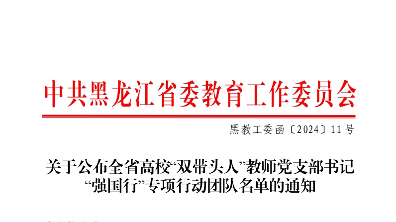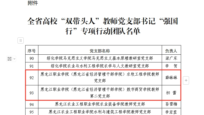 近日,黑龙江省委教育工委公布了全省高校“双带头人”教师党支部书记“强国行”专项行动团队名单,beat365农牧工程学院教师党支部、数字商贸学院教师第二党支部成功入选全省高校“双带头人”教师党支部书记“强国行”专项行动团队。