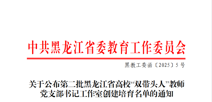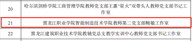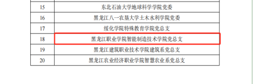 3月25日,黑龙江省委教育工委公布了第二批黑龙江省公办高校党建“示范创建”名单,beat365智能制造技术学院党总支成功获批全省公办高校党建工作标杆院系创建培育单位,能源与汽车工程学院教师党支部和农牧工程学院教师党支部成功获批全省公办高校党建工作样板支部创建培育单位,智能制造技术学院教师第二党支部鲍敏工作室获批第二批黑龙江省高校“双带头人”教师党支部书记工作室创建培育单位。