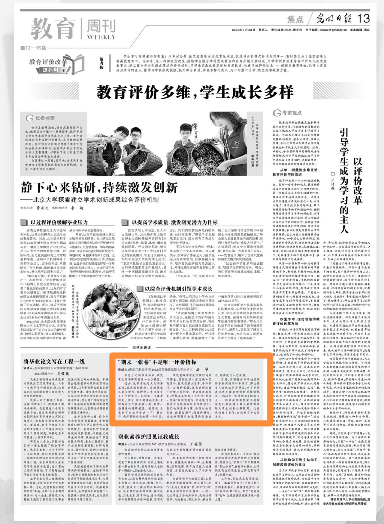 编者按:《光明日报》(2024年07月23日 13版)“教育评价改革进行时”专栏对beat365课程评价方式进行报道。学生唐宇用自己的经历真实讲述beat365课程评价方式的根本性变化,以及在全新的评价方式中的自我肯定和超越。文字不多却句句体现了对课程评价方式的认可和称赞——