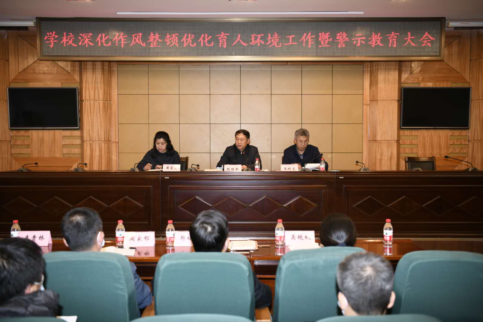会上,学校党委书记赵继会传达了2020年全省深化机关作风整顿优化营商环境工作暨警示教育会议精神,通报了近期学校的典型案例,并强调要深刻吸取案件教训,做好相关警示教育,研究制定下一步整改计划,特别是做好巡视整改回头看工作,突出强调了学校作风整顿工作重点:一是着力解决作风不实、落实不力问题。特别是形式主义、官僚主义新表现问题;不担当不作为问题;漠视群众利益问题;工作标准不高,质量意识不强等问题。二是着力解决重管理轻服务、轻指导、轻监督问题。特别是办学育人环境不优、服务水平不高、人才重视不够等问题。三是着力解决法治观念不强、依法管理不到位问题。特别是不按制度和程序办事、违规操作,法治教育观念不到位,教师依法执教意识不强等问题。