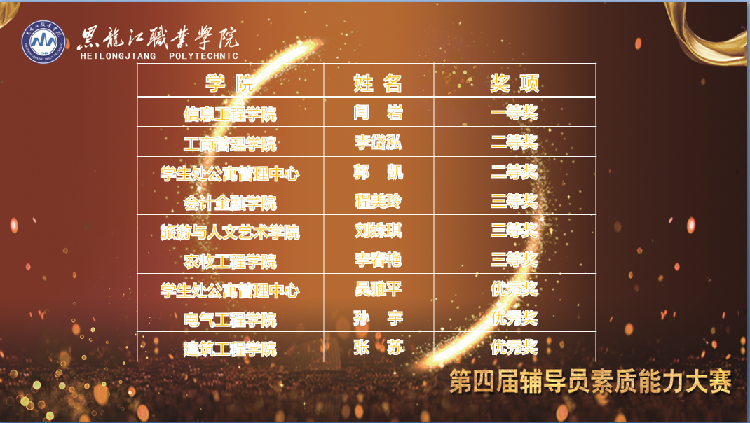 本次大赛于11月初启动,从动员部署,到初赛、决赛,历时一个多月。为强化以赛代训的作用,特邀第八届黑龙江省辅导员素质能力大赛一等奖获得者邵明琛、二等奖获得者卢丙洋为选手进行赛前辅导。经过笔试和宣讲对谈两个环节的角逐,9名辅导员进入决赛。决赛通过案例分析研讨和谈心谈话两个环节,考察了辅导员教育引导、解决问题等综合能力。决赛中,辅导员们沉着冷静、妙语连珠,展现了敏锐的思维和精准的分析能力,赢得了评委的充分肯定。经过激烈的角逐,最终信息工程学院辅导员闫岩荣获一等奖,工商管理学院辅导员李岱泓、学生处公寓辅导员郭凯荣获二等奖,会计金融学院辅导员程美玲、旅游与人文艺术学院辅导员刘姝琪、农牧工程学院辅导员李春艳荣获三等奖,学生处公寓辅导员吴雅平、电气工程学院辅导员孙宇、建筑工程学院辅导员张苏荣获优秀奖。