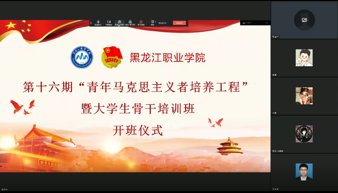 为深入学习贯彻习近平新时代中国特色社会主义思想,进一步推动“青年马克思主义者培养工程”工作深入开展,根据团中央《“青年马克思主义者培养工程"实施纲要》精神,校团委于6月6日至6月12日举办了第十六期“青年马克思主义者培养工程”暨大学生骨干培训班。6月6日,培训班开班式在钉钉线上平台举行,校团委书记邹春雷,二校区团委负责人梁立,校团委组宣办主任唐晓恬,校团委干事魏然、马雨薇、马天翔、常通、马莉,2019级校团委兼学生副书记李君鹏、张雪岩、徐琳,2020级校团委兼学生副书记关成、常雨欣、樊泽宇,第十六期“青马工程”暨大学生骨干培训班全体学员参加开班式,拉开本期培训班的序幕。