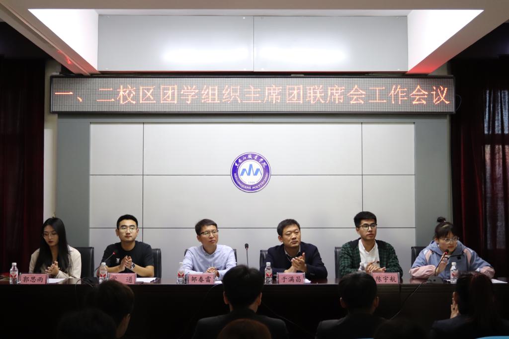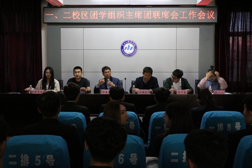 10月26日,学校召开一、二校区团学组织主席团联席会工作会议。校团委书记邹春雷,副书记于满昌,团委学生副书记陈宇航、郭思雨、戴天欣以及一、二校区77名主席团联席会成员参加会议。会议由二校区学工部教师常通主持。