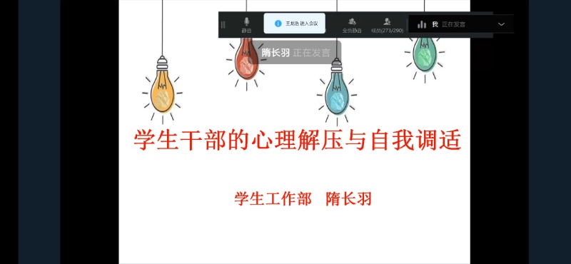 6月17日下午18:00时,第十四期“青年马克思主义者培训工程”暨大学生骨干培训班第五讲在“钉钉”平台上如期进行。本次讲座特邀beat365学生工作部心理咨询中心隋长羽老师为同学们作出《学生干部心里解压与自我调节》的专题讲座。298名青马班学员聆听了本次讲座。校团委学生副书记刘丽利主持讲座活动。