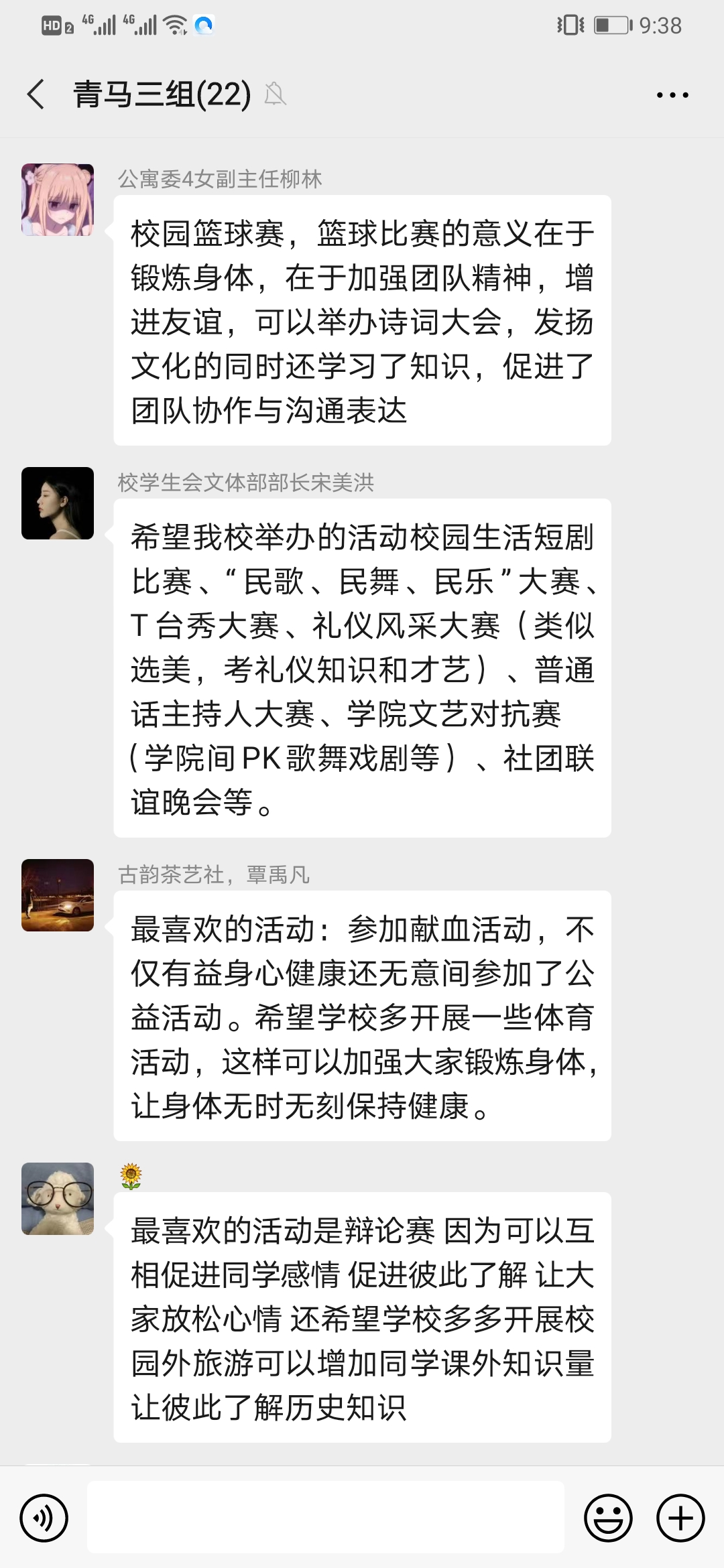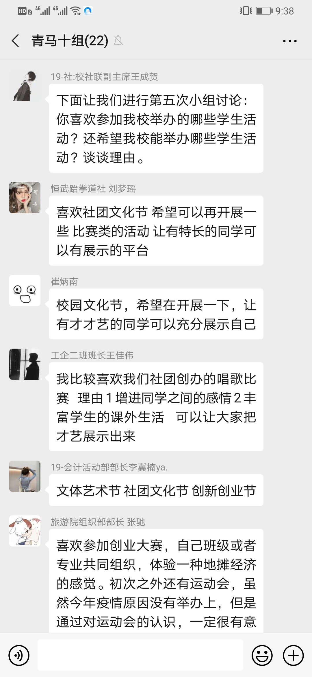 在小组讨论环节,同学们就“你喜欢参加beat365举办的哪些学生活动?还希望beat365能举办哪些学生活动?”展开了充分的讨论,同学们纷纷发言,并解释,学生活动可以锻炼自己、展现自己,也可以建立与人沟通的能力和交往能力,还可以锻炼大家的团队协助能力。