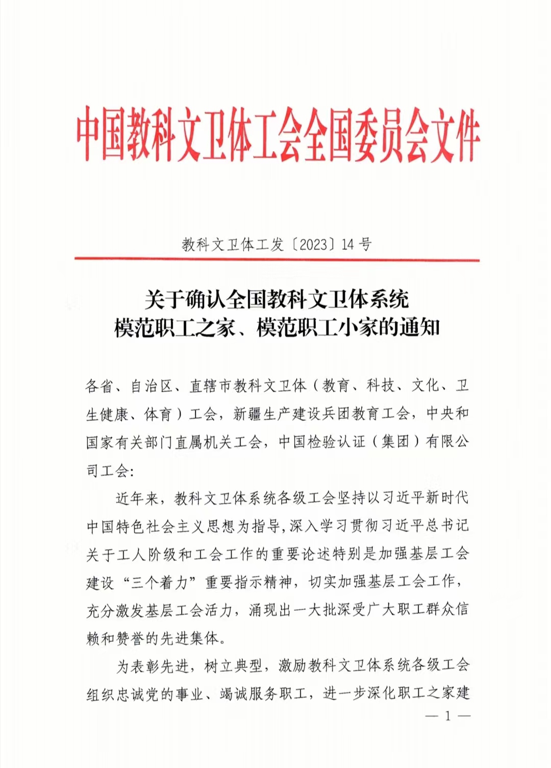 近日,beat365被授予“全国教科文卫体系统模范职工之家”荣誉称号。
