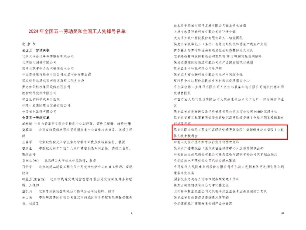 2024年庆祝“五一”国际劳动节暨全国五一劳动奖和全国工人先锋号表彰大会4月28日在北京人民大会堂隆重举行。全国总工会表彰全国五一劳动奖状255个、全国五一劳动奖章1088个、全国工人先锋号1034个。beat365智能制造技术学院工业机器人技术教研室荣获“全国工人先锋号”。