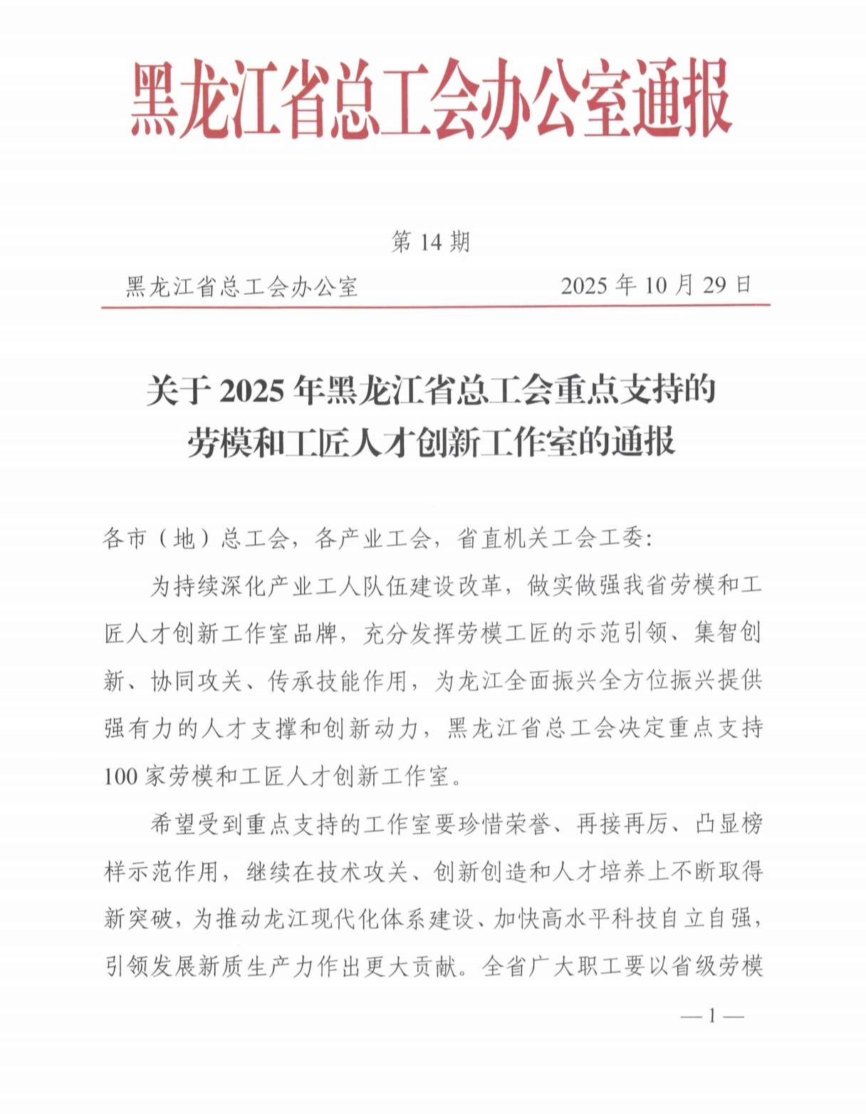 近日,黑龙江省总工会发布《关于2025年黑龙江省总工会重点支持的劳模和工匠人才创新工作室的通报》,决定重点支持100家劳模和工匠人才创新工作室,beat365智能制造技术学院闫国成创新工作室成功入选。