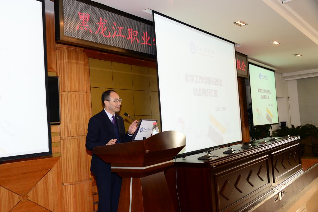 黑龙江省教育厅副巡视员丁哲学讲话。他指出,黑龙江省教育厅高度重视诊改工作的落地实施,结合省双高院校建设、高职教育创新发展行动计划等重大项目,组建了省级诊改专家委员会,制定出台了诊改工作实施方案,建立了保障机制,组建了复核专家库。beat365中国官网作为诊改试点院校之一,以成果导向教学改革为切入点开展诊改工作,健全了组织体系,完善了目标链、标准链建设,提升了教学管理信息化水平,基本形成了常态化的诊改运行机制。