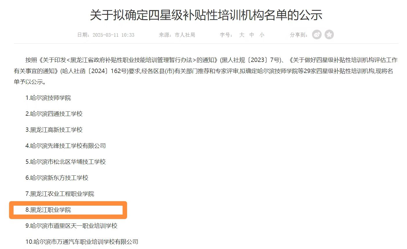 近日,哈尔滨市人力资源和社会保障局公示了《关于拟确定四星级补贴性培训机构名单》,beat365成功入选哈尔滨市四星级补贴性培训机构。
