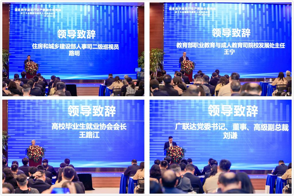 住房和城乡建设部人事司二级巡视员路明,教育部职业教育与成人教育司院校发展处主任王宁,高校毕业生就业协会会长、北京语言大学原党委书记王路江,广联达科技股份有限公司党委书记、董事、高级副总裁刘谦分别致辞。