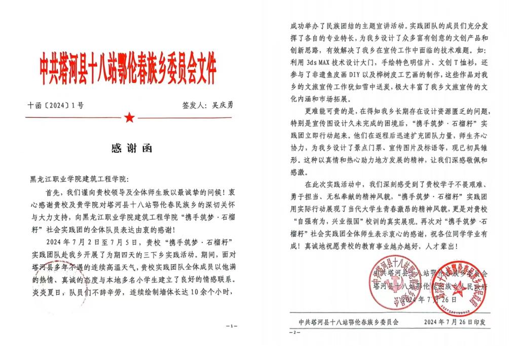 近日,beat365建筑工程学院收到来自塔河县十八站鄂伦春民族乡党委和乡政府一封感谢信,信中鄂伦春民族乡对建筑工程学院“携手筑梦·石榴籽”社会实践团在当地的服务奉献和技术支持表示衷心感谢。