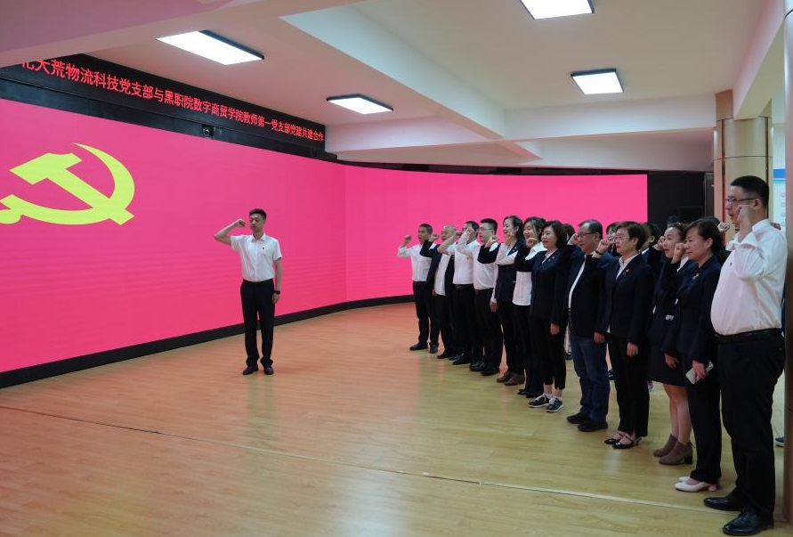 活动现场,与会领导与各位党员共同参观北大荒物流仓储交易中心,领略了北大荒物流集团数字化、智慧化的数据系统平台。签约仪式上,张玲介绍了学院概况,诚挚邀请北大荒物流集团各位领导赴beat365中国官网参观交流。数字商贸学院教师第一党支部书记张卓远与天津北大荒物流科技党支部书记朱勇签署了党建共建协议书。最后,在鲜红的党旗下,全体党员重温入党誓词,赓续红色血脉,坚定初心使命。