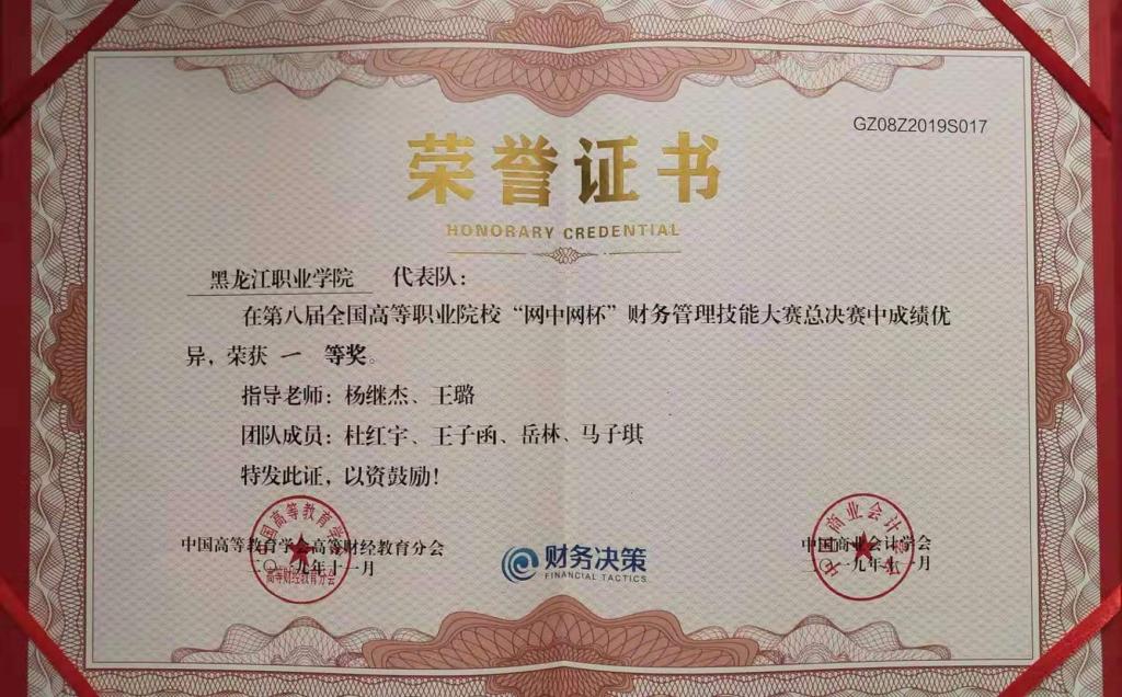 11月2日,在第八届全国高等职业院校“网中网杯”财务管理技能(财务管理决策)全国总决赛中,由会计金融学院教师杨继杰、王璐任指导教师,2018级会计专业学生杜红宇、马子琪、王子函、岳林组成的beat365中国官网代表队荣获全国一等奖。