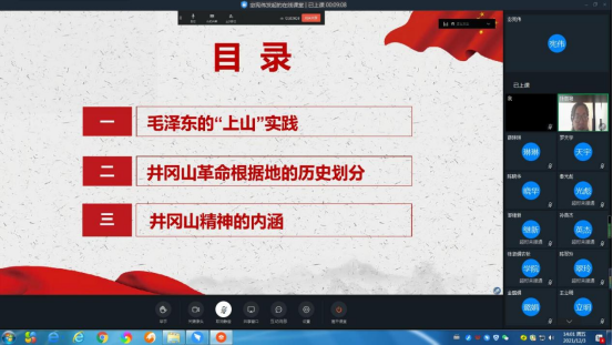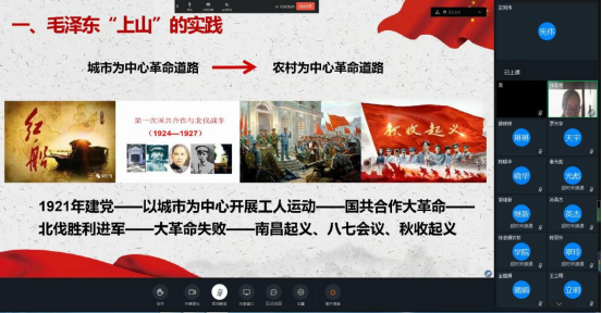 “欲知大道,必先为史。”今年是建党一百周年,为推动党史学习教育深入开展,营造“学党史、悟思想、办实事、开新局”的浓厚氛围,根据中共中央开展四史宣传教育的通知,学校组建了党史学习教育宣讲团开展党史教育。12月3日下午,农牧工程学院党总支特邀请学校党史学习教育宣讲团成员、思想政治教研部张丽艳老师,以《井冈山的斗争与井冈山精神》为题,为农牧工程学院全体教师和学生代表开展了一次线上党史学习教育。活动由农牧工程学院党总支书记侯继勇主持。