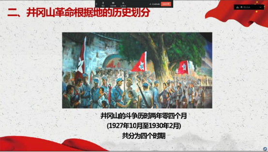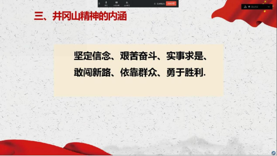 宣讲中,张丽艳以习近平总书记三上井冈山为切入点,强调“行程万里,不忘初心”,井冈山是革命的山、战斗的山,也是英雄的山、光荣的山。张丽艳用生动的语言和详细的图文,从三个方面介绍井冈山的斗争与精神——毛泽东的“上山”实践、井冈山革命根据地的历史划分、井冈山精神的内涵,带我们又一次重温了那个战火纷飞的年代,中国共产党是如何一步步从井冈山走向新中国。