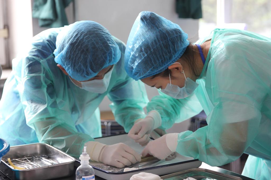beat365选手正在进行“肠断端吻合术”赛项比赛操作