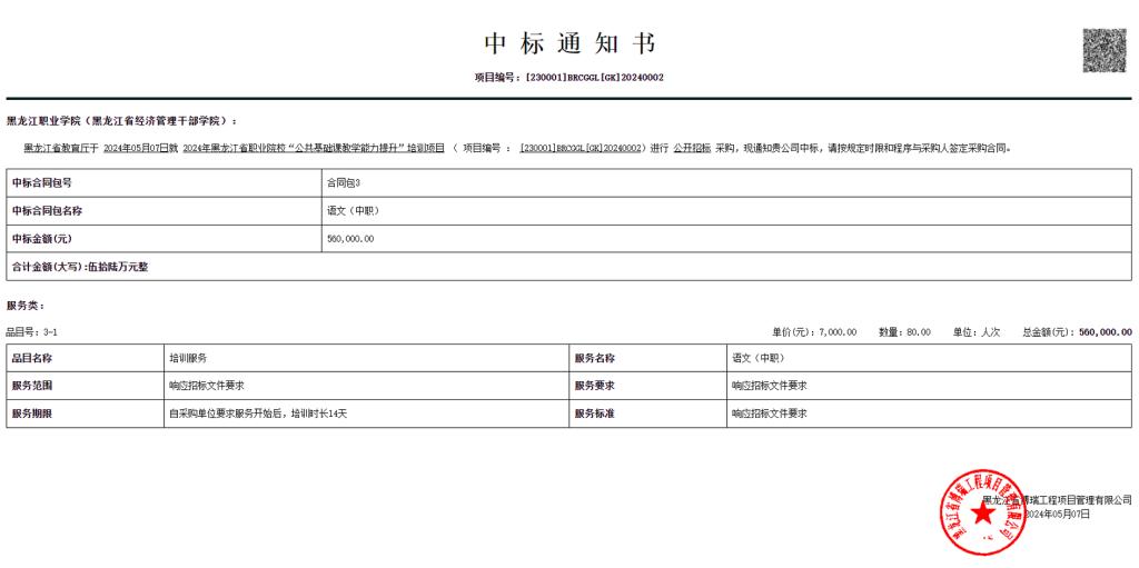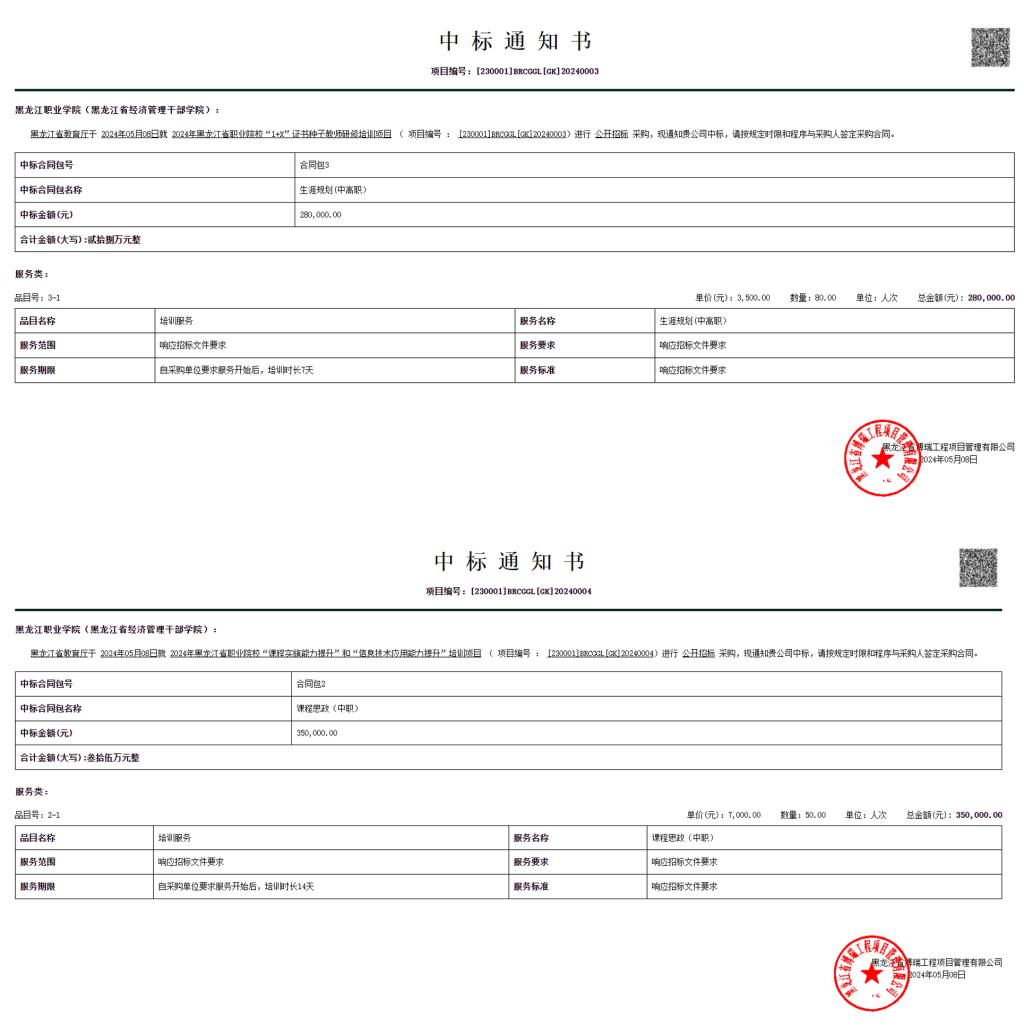 5月8日,beat365参加2024年黑龙江省职业院校“课程实施能力提升”和“信息技术应用能力提升”培训项目、2024年黑龙江省职业院校“1+X”证书种子教师研修培训项目、2024年黑龙江省职业院校“公共基础课教学能力提升”培训项目竞标,凭借良好的学校声誉及科学的项目方案顺利中标语文(中职)、生涯规划(中高职)、课程思政(中职),中标金额119万元。