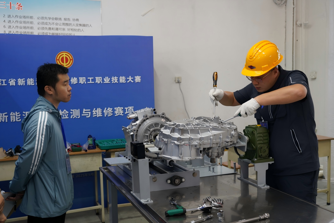 来自全省各市(地)产业工会的参赛队员,围绕新能源汽车维修核心技术展开激烈角逐,以精湛技艺书写新时代产业工人的奋斗篇章。本次技能大赛聚焦新能源汽车产业发展和高技能人才培育,立足行业技术前沿与岗位实际需求,采用“理论考核+实操竞技”的竞赛模式,全面检验参赛选手的专业素养与实战能力。