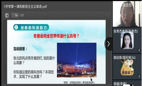 新学期第一课是线上课,时值2022北京冬奥会胜利举办,教师充分利用冬奥契机,带领学生回首奥运、再看冬奥,看今朝辉煌、忆往昔峥嵘,引导学生感悟我国的大国心态和绿色办奥兑现双碳目标,运动员顽强拼搏展现中国力量等。通过挖掘冬奥魅力和冬奥精神,勉励学生不负时代、不负青春,勇于挑战自我,在未来的人生道路上敢于担当、勇攀高峰,一起向未来。