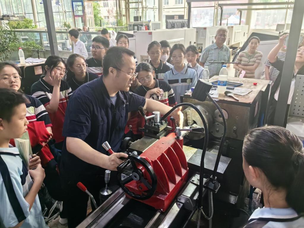 同学们先后参观了虚仿基地、工业中心、机械加工中心、机器人训练中心,在虚拟的场景感受沉浸式教学方式带来的新奇感。王继斌老师现场为同学们车制了钢制工件,崔明老师向同学们介绍的卡具使用方法。