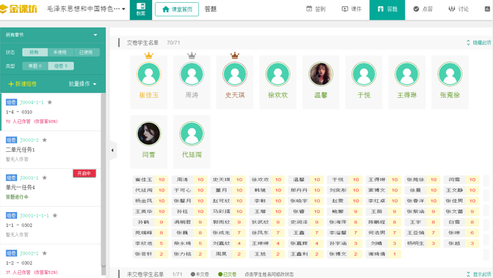 课后进行巩固拓展。学生除了在“知到”中课前预习,教师要根据教学大纲、结合形势与政策、在“金课坊”中对每个单元布置课后拓展作业,以提升学生分析问题、概括问题和明辨是非的能力。教师对作业进行批改,并进行答疑指正。
